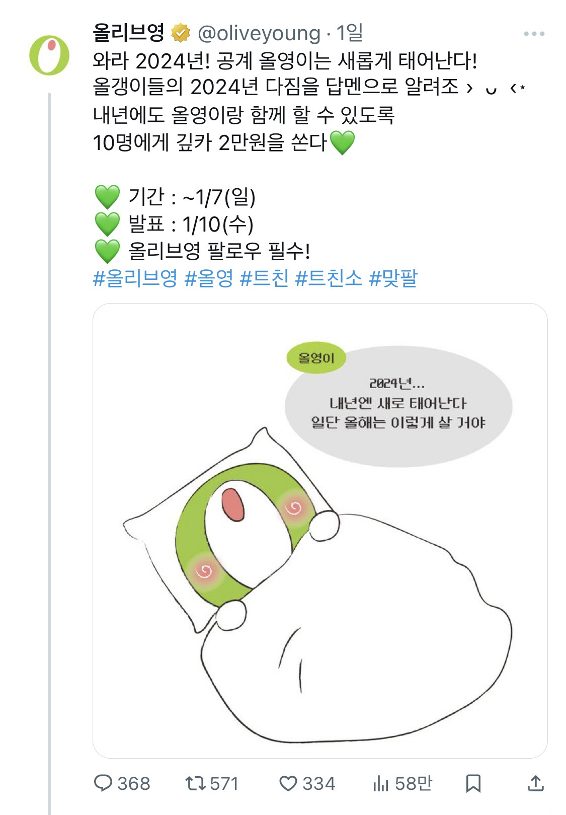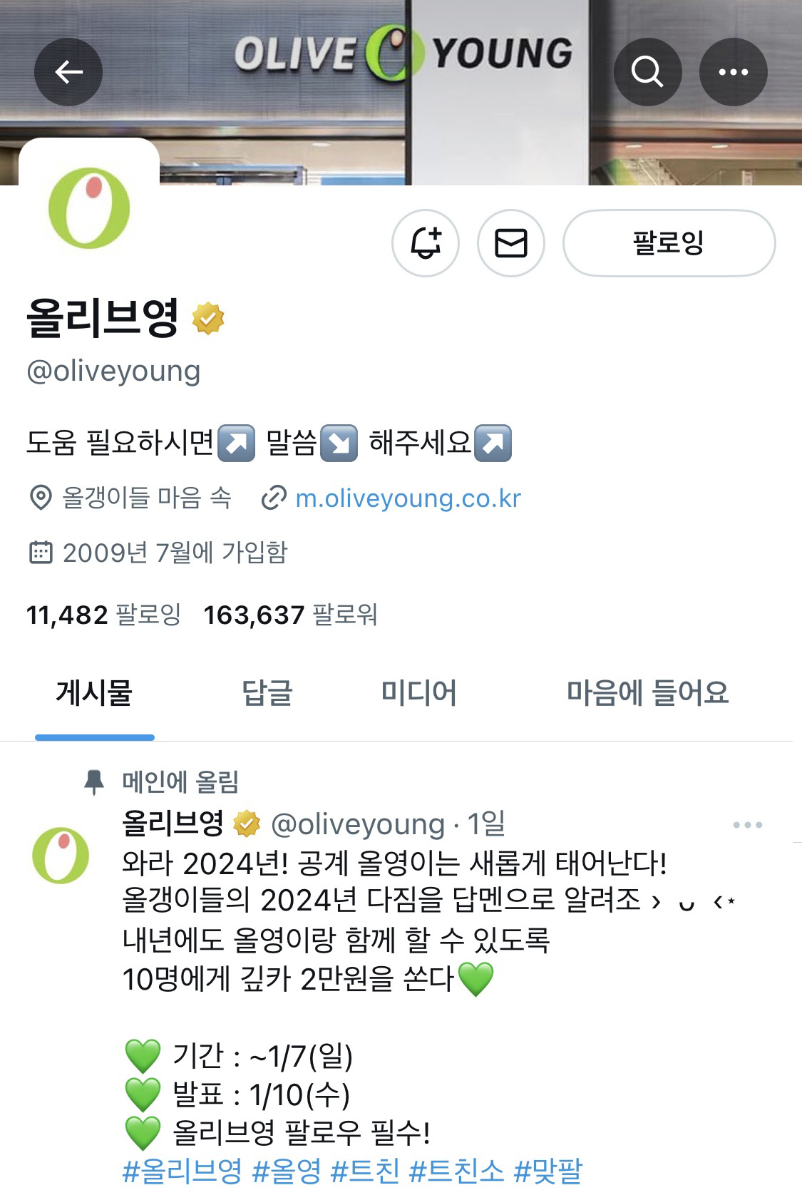 헬스&뷰티 스토어 올리브영은 엑스를 통해 브랜드 팬들과 소통을 활발하게 전개하는 대표적인 브랜드예요. 엑스에서는 다른 계정을 태그해 게시글을 작성하는 것이 전혀 어색하지 않아서, 소비자들이 브랜드 계정을 태그하는 모습도 쉽게 볼 수 있는데요. 올리브영은 태그된 게시물을 인용해 제품을 추천하는 등 ‘소비자’를 엑스의 SNS 활동에 자주 참여시키고요. 이는 곧 브랜드 팬덤 형성으로까지 이어졌는데요. 올리브영은 엑스에서 그들의 충성 고객을 ‘올갱이’라고 부릅니다. 프로모션 및 이벤트 홍보도 내 친구 ‘올갱이’에게 꿀템을 알려주는 형식으로 친근하게 공유해요. 그뿐만 아니라 엑스의 주요 특징인 ‘확산력’을 이용해 팔로우 및 재게시 이벤트도 빈번하게 진행하면서 계정을 발전시키고 있어요.