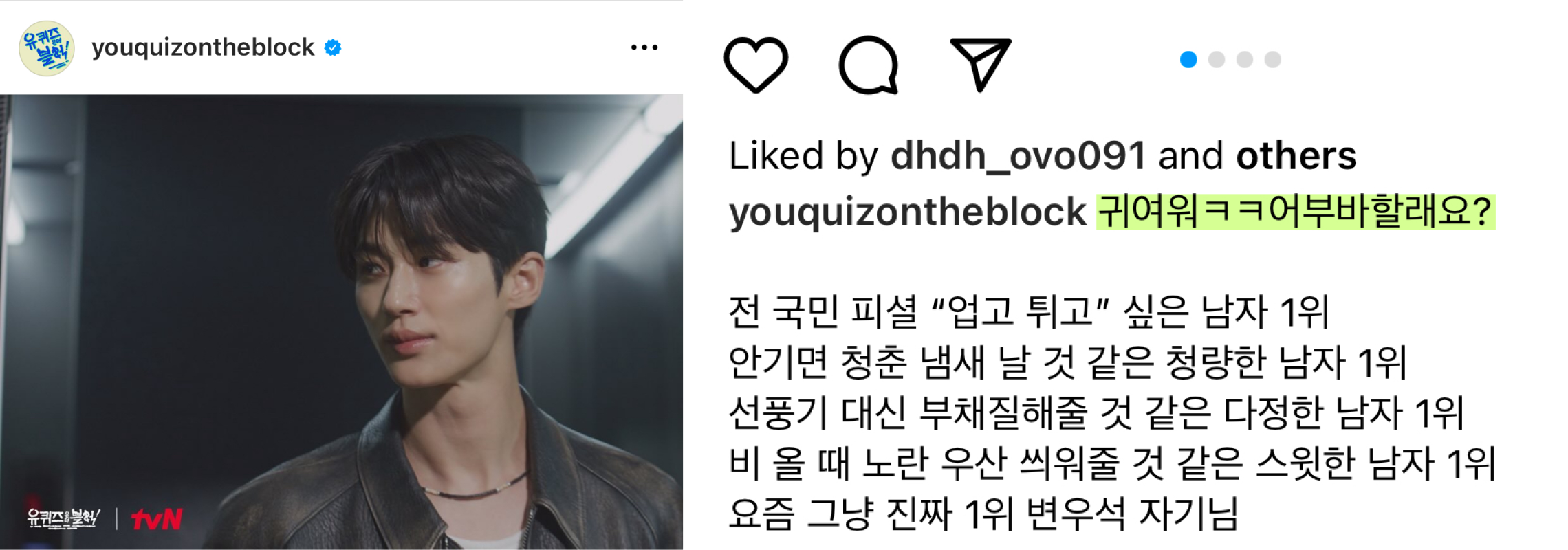 이렇게 직설적인 워딩의 밈을 적당히 순화해서 사용한 좋은 예시가 있습니다. 유퀴즈온더블록 인스타그램에서 '선재 업고 튀어'로 사랑받고 있는 변우석 배우 관련 콘텐츠를 올렸는데요.