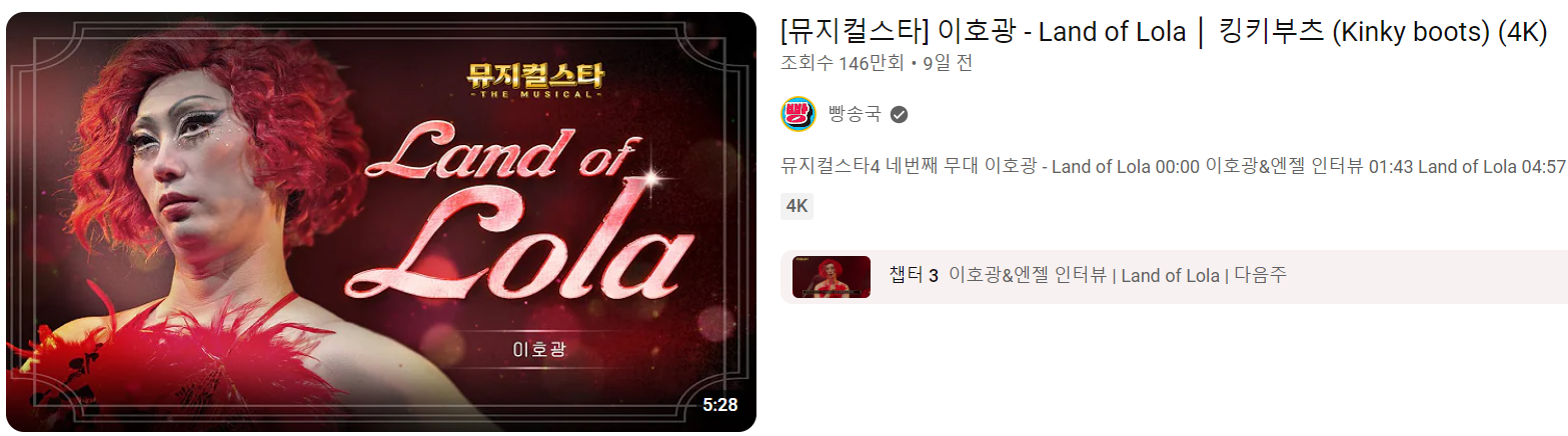 그의 새로운 캐릭터 '이호광'은 뮤지컬 배우 컨셉으로서 킹키부츠의 Land of Lola를 패러디한 영상을 업로드한 것인데요. 개그맨답게 과장하고 우스꽝스럽게 연출할 수도 있었겠지만 언뜻 보면 실제 뮤지컬 배우 같다는 평을 들을 정도로 높은 퀄리티를 보여줬답니다. 해당 콘텐츠가 뮤지컬 팬들 사이에서 화제가 되고 엄청난 중독성을 불러일으키며 나날이 조회수도 상승 중이랍니다.