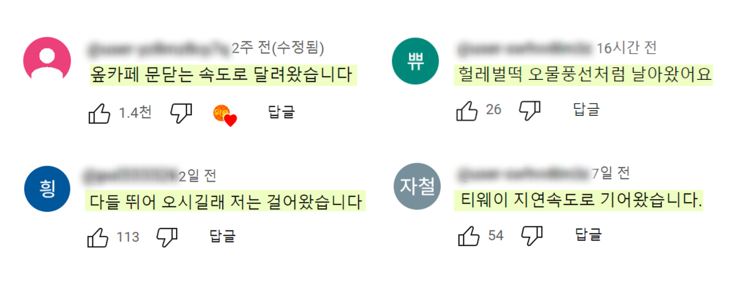 예를 들어 김풍이 등장하는 영상에는 댓글로 그가 창업했던 옾카페를 언급하며 '옾카페 문 닫는 속도로 달려왔습니다'라는 댓글이 달리기도 하고, 북한의 오물풍선이 언론에서 많이 언급되면서 '오물풍선처럼 날아왔습니다'라는 풍자적 밈이 생기기도 했어요. 그 외에도 다양하게 베리에이션 되는 댓글을 보며 사람들의 센스를 엿볼 수 있답니다.
