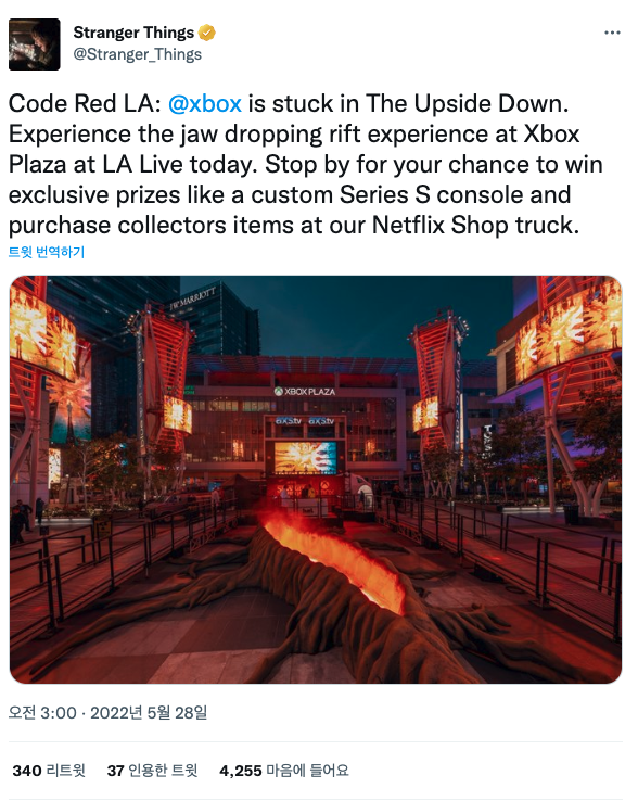 이번 <기묘한 이야기> 시즌4 공개에서 가장 글로벌한 캠페인은 무엇보다 세계 곳곳의 랜드마크에 드라마 세계관 내에서 뒤집힌 세계와 연결되는 포털인 리프트를 설치한 거예요. 뉴욕의 엠파이어스테이트 빌딩부터 LA의 XBox 플라자, 그 외에도 호주, 밀라노, 뭄바이, 독일, 콜롬비아, 사우디아라비아, 폴란드, 스톡홀름, 스페인 등 주요 국가와 도시에 리프트를 만들면서 이미 공개 전부터 전 세계적인 홍보가 시작되었어요.