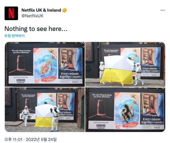 넷플릭스가 고심한 레트로 콘셉트는 오프라인 마케팅으로도 이어졌는데요. 넷플릭스에서 올린 마케팅 사진을 보면, 마치 <기묘한 이야기>의 한 장면을 보는 것처럼 연구진들이 뒤집어진 세계로 가는 게이트를 장막으로 가려놓은 퍼포먼스를 볼 수 있어요. 실제로 이런 퍼포먼스들이 공개 당시에 바이럴이 되기도 했는데요. 그런데 이 배경을 자세히 보면, 시즌4의 핵심적인 서사를 구성하는 아이템이나 브랜드의 광고라는 걸 볼 수 있죠. 서퍼&피자, 홀랜드 세계, 호킨스 전력 등등 드라마 안 가상의 브랜드를 광고 배너로 만들었어요. 게다가 이 광고판들의 디자인 역시 80년대 레트로 스타일로 디자인이 되어있어서 그 자체로 볼거리가 되면서도 드라마의 세계관을 유지시켜주기도 해요.