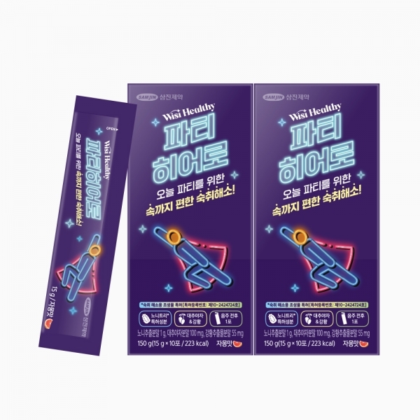 삼진제약 '위시헬씨'의 '파티히어로'는 MZ세대 직장인을 메인 타겟으로 설정한 젤 타입의 숙취해소제예요. '파티의 주인공은 나! 숙취의 고통을 없애주는 히어로라는 컨셉으로 귀여움을 더했고요. 파티를 연상시키는 네온사인 로고가 인상적이에요. 숙취 해소제의 맛없는 이미지를 바꾸고자, 쫀득한 식감과 상큼한 자몽맛을 더했어요. 특히 가지고 다니기도 쉽고, 물 없이 쉽게 섭취할 수 있다는 점도 MZ세대를 겨냥한 포인트예요.